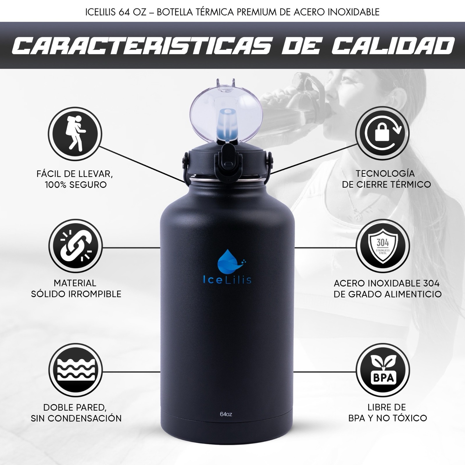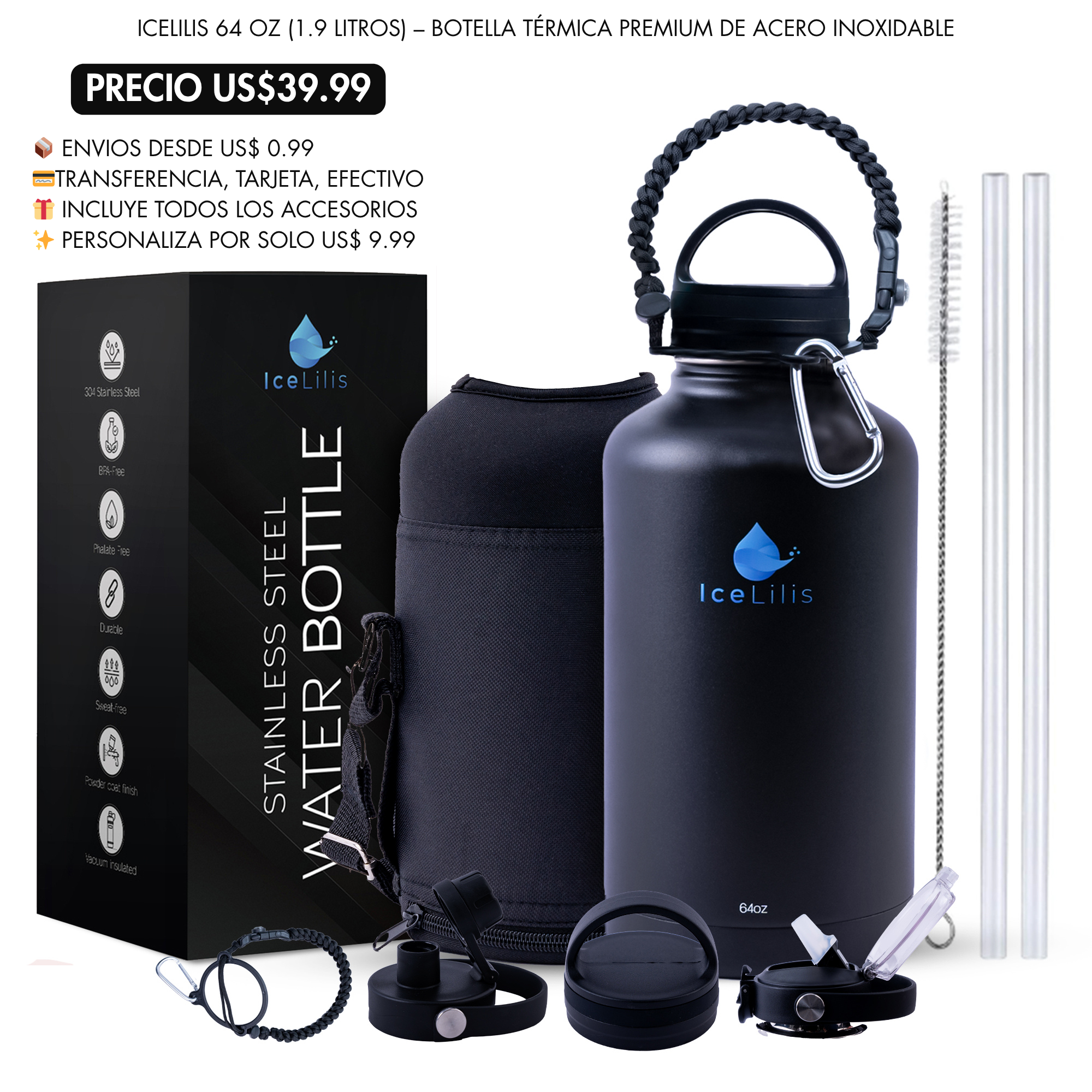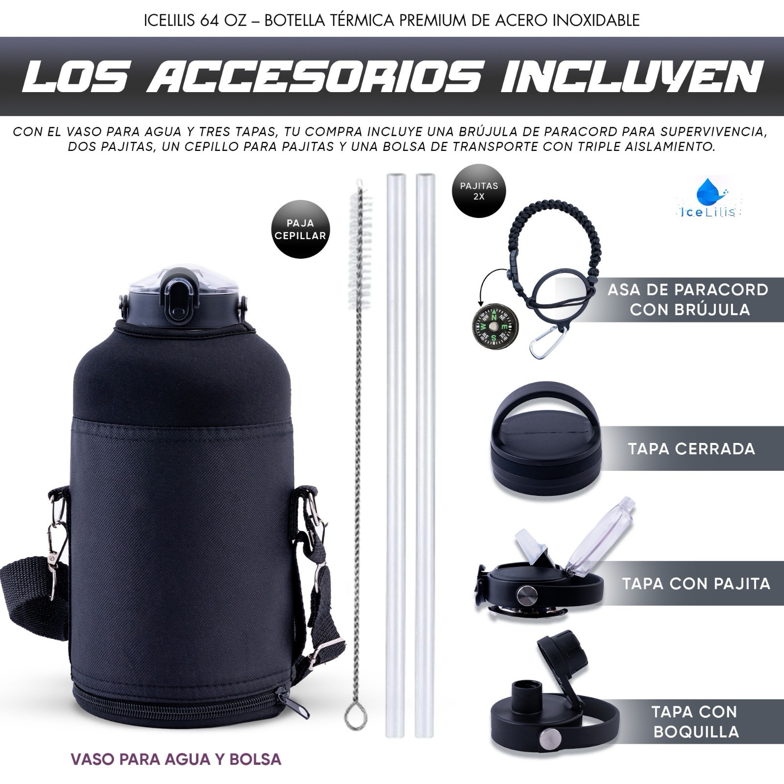 ICELILIS Botella Térmica Negra 64 Oz Set Completo