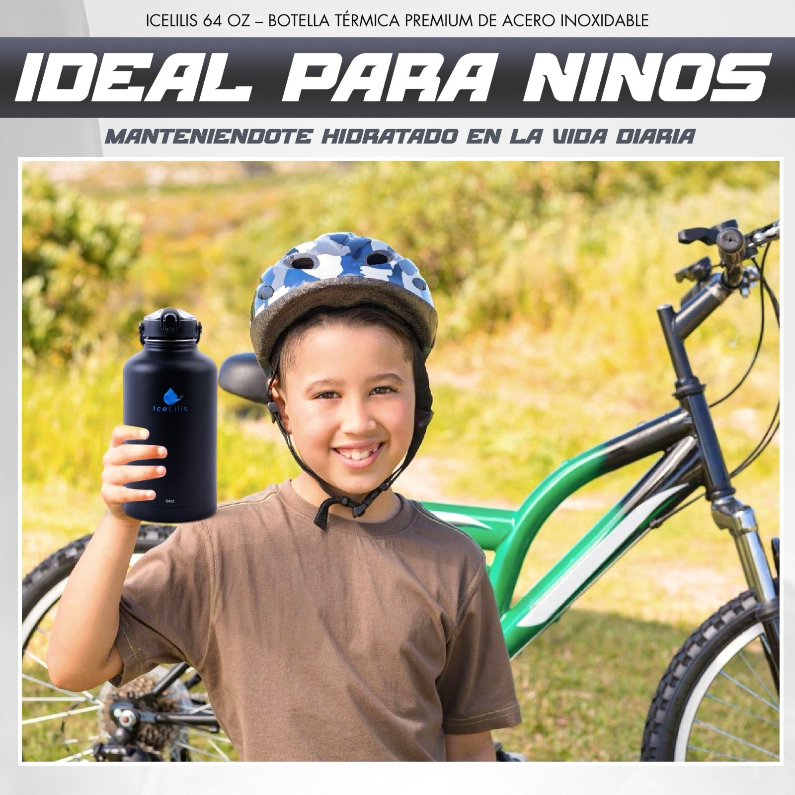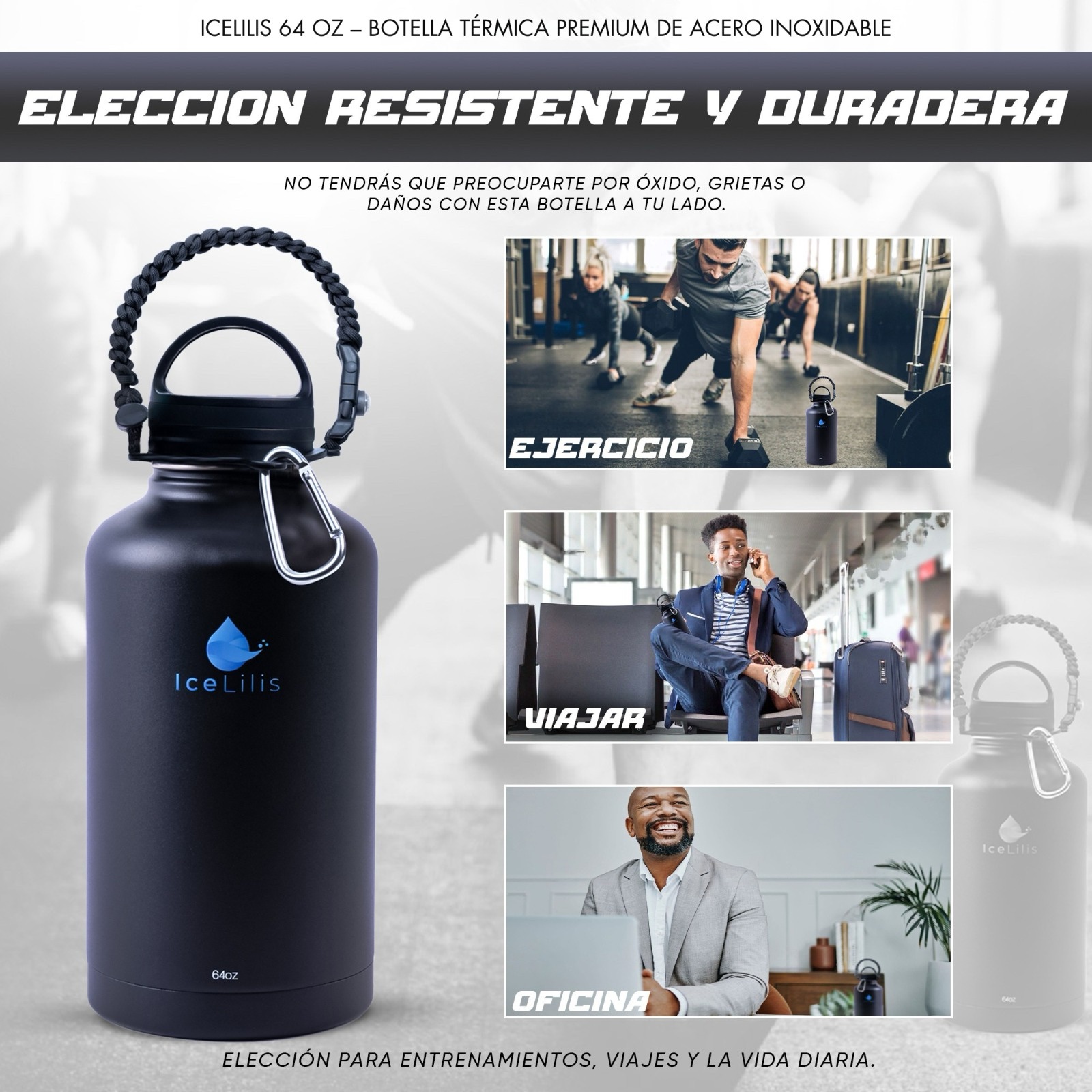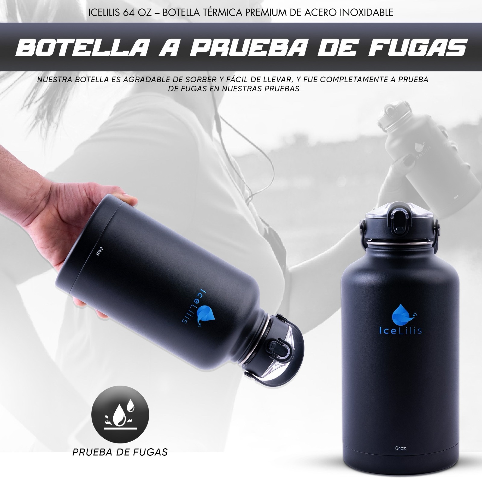 ICELILIS Botella Térmica Negra 64 Oz Set Completo