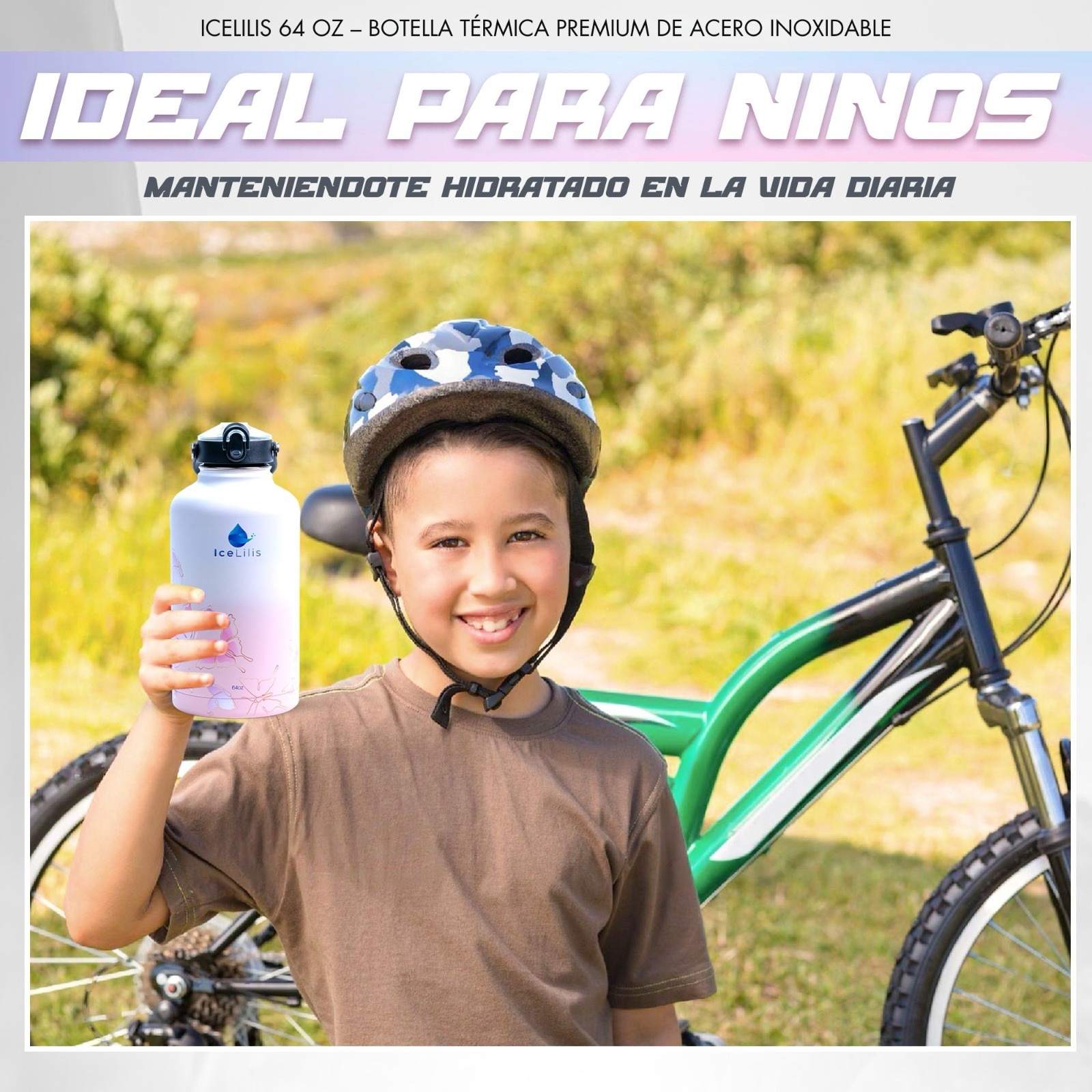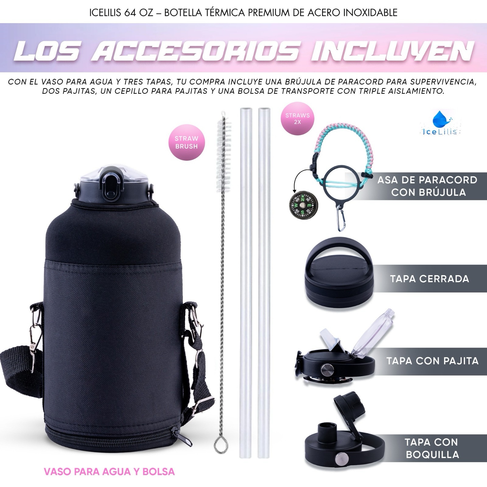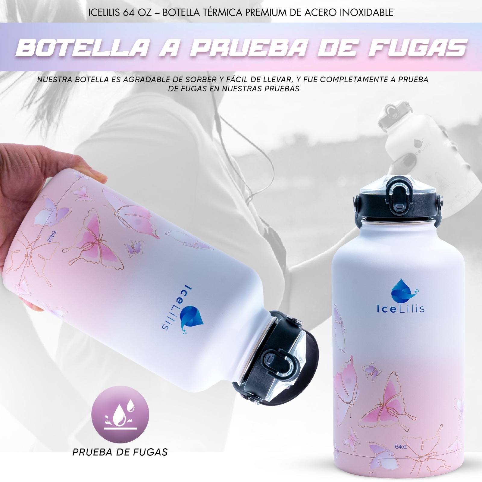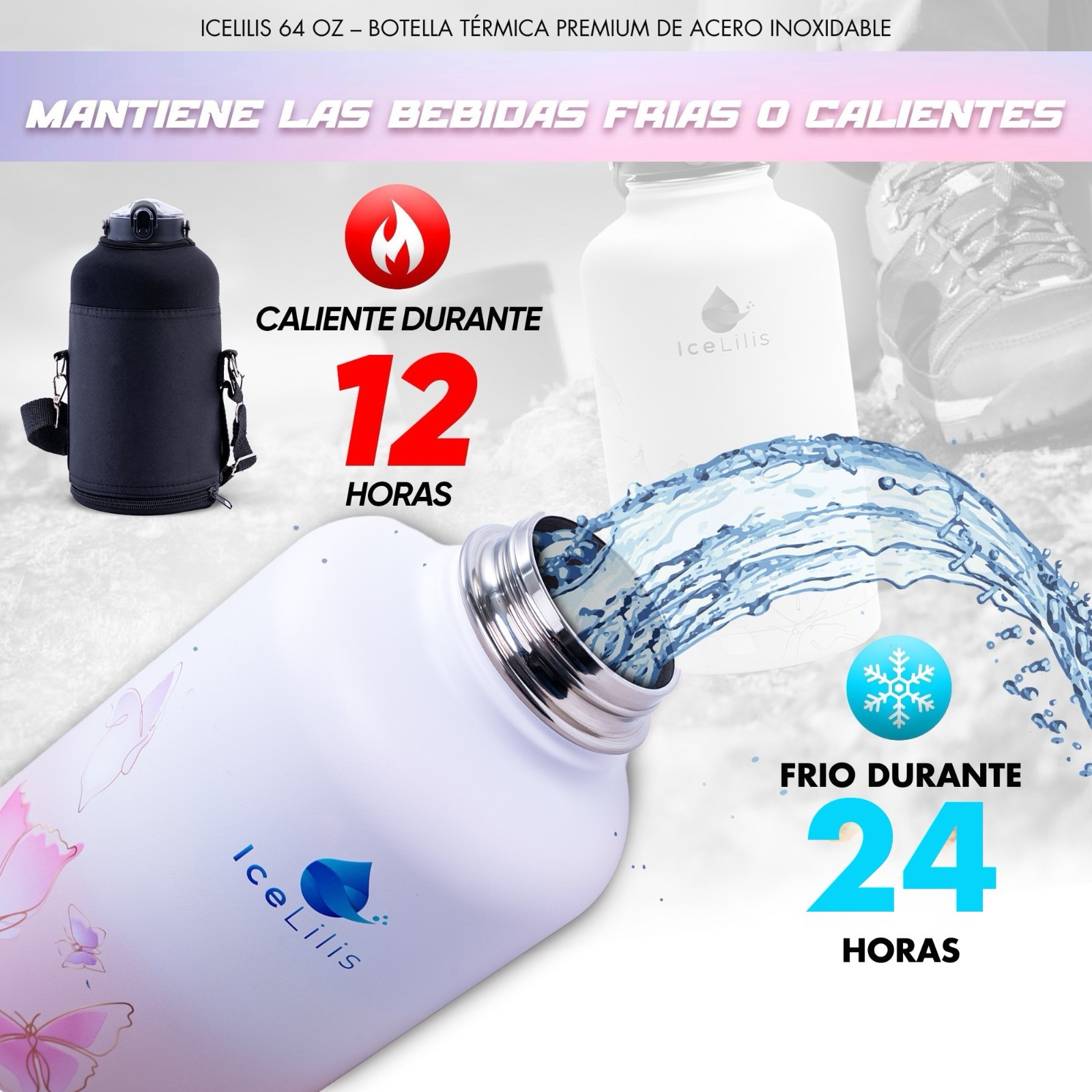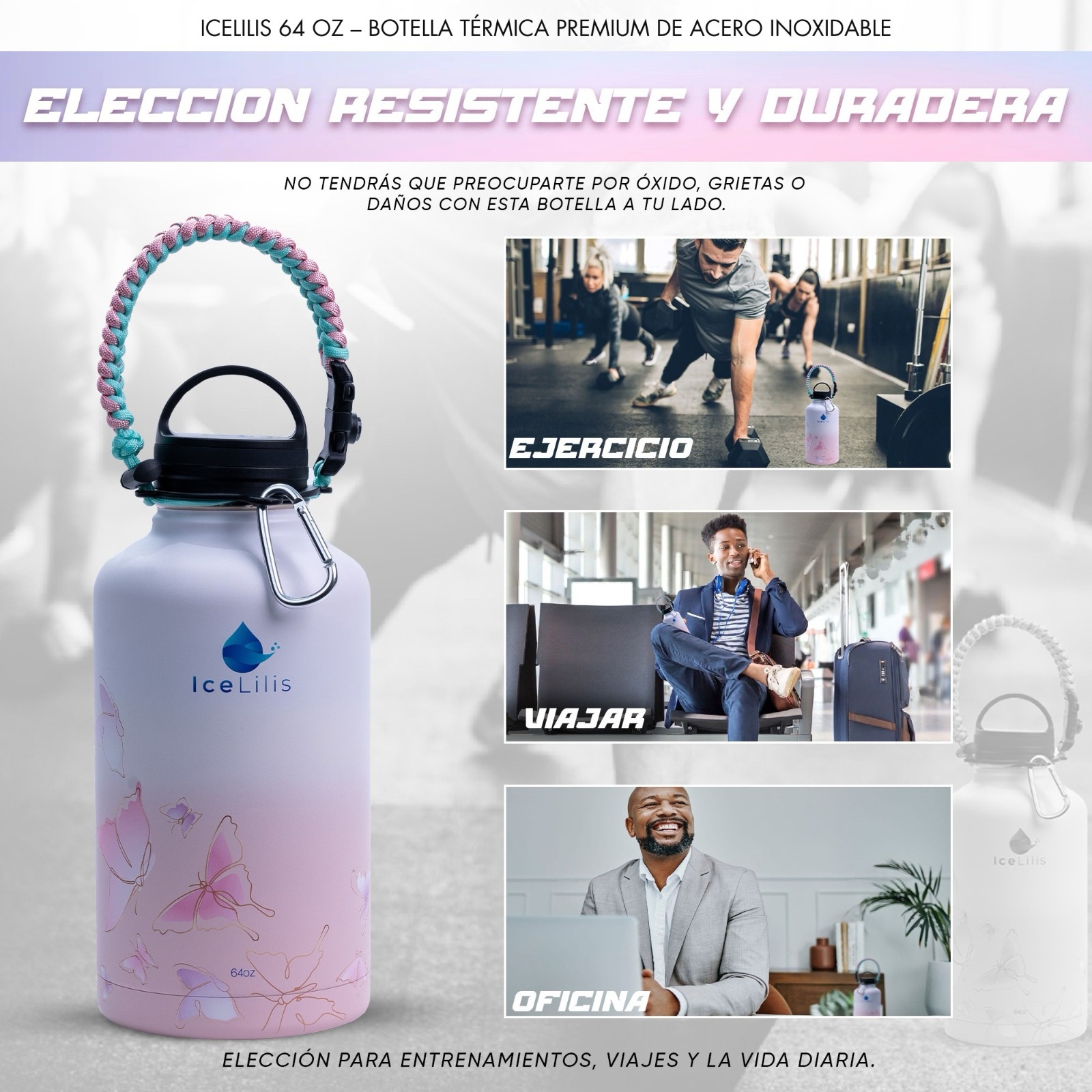 Esta es una botella de agua de 64 oz (medio galón) fabricada con acero inoxidable de grado alimenticio y alta resistencia, perfecta para entrenamientos, viajes largos o simplemente para mantenerte hidratado en la vida diaria. Al estar hecha de acero inoxidable, es una opción duradera que podrás conservar y usar durante muchos años.